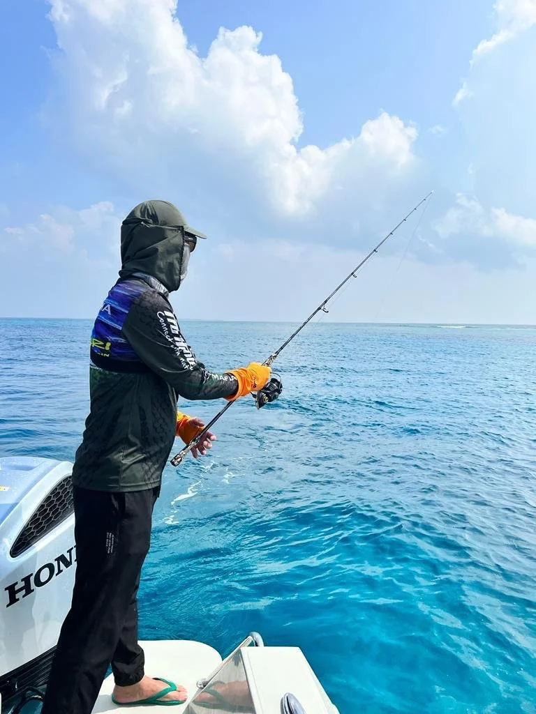 The photographs clearly show how the API fishing activities took place amidst the iconic crystal blue waters of the Maldives. The contrast between the bright sky, the stunning turquoise sea, and the shallow coral reefs creates an ideal ambiance. This atmosphere is perfectly recorded where an angler is standing on the edge of the boat, enjoying the clarity of the water while in action. The bright weather and calm sea indicate highly supportive fishing conditions, allowing casting and jigging techniques to be executed optimally.